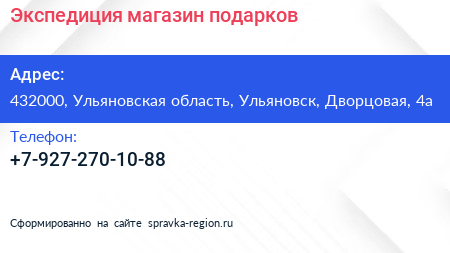 Экспедиция, магазин подарков по адресу 432000, Ульяновская область, Ульяновск, Дворцовая, 4а в дальнейшем Организация, размещена в следующих категориях: