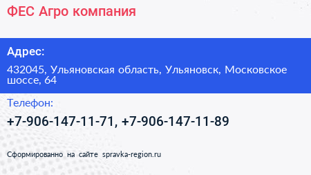 ФЕС-Агро, компания по адресу 432045, Ульяновская область, Ульяновск, Московское шоссе, 64 в дальнейшем Организация, размещена в следующих категориях: