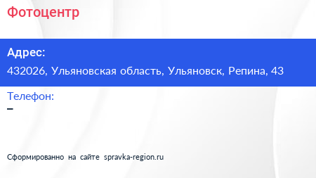 Фотоцентр по адресу 432026, Ульяновская область, Ульяновск, Репина, 43 в дальнейшем Организация, размещена в следующих категориях: