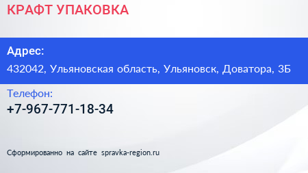 КРАФТ УПАКОВКА по адресу 432042, Ульяновская область, Ульяновск, Доватора, 3Б в дальнейшем Организация, размещена в следующих категориях: