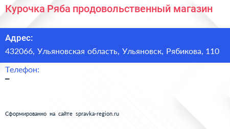 Курочка Ряба, продовольственный магазин по адресу 432066, Ульяновская область, Ульяновск, Рябикова, 110 в дальнейшем Организация, размещена в следующих категориях: