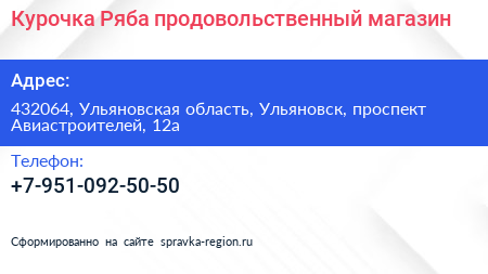 Курочка Ряба, продовольственный магазин по адресу 432064, Ульяновская область, Ульяновск, проспект Авиастроителей, 12а в дальнейшем Организация, размещена в следующих категориях:
