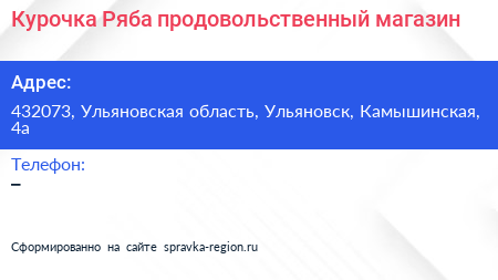 Курочка Ряба, продовольственный магазин по адресу 432073, Ульяновская область, Ульяновск, Камышинская, 4а в дальнейшем Организация, размещена в следующих категориях: