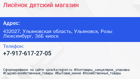 Лисёнок, детский магазин по адресу 432027, Ульяновская область, Ульяновск, Розы Люксембург, 36Б киоск в дальнейшем Организация, размещена в следующих категориях: