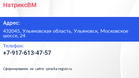 НатриксВМ по адресу 432045, Ульяновская область, Ульяновск, Московское шоссе, 24 в дальнейшем Организация, размещена в следующих категориях: