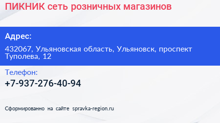 ПИКНИК, сеть розничных магазинов по адресу 432067, Ульяновская область, Ульяновск, проспект Туполева, 12 в дальнейшем Организация, размещена в следующих категориях: