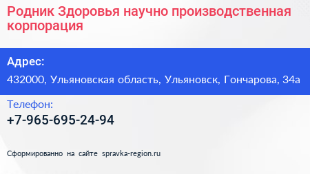 Родник Здоровья, научно-производственная корпорация по адресу 432000, Ульяновская область, Ульяновск, Гончарова, 34а в дальнейшем Организация, размещена в следующих категориях: