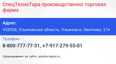СпецТехноТара, производственно-торговая фирма по адресу 432018, Ульяновская область, Ульяновск, Хваткова, 17е в дальнейшем Организация, размещена в следующих категориях: