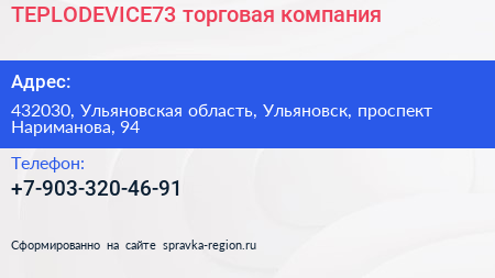 TEPLODEVICE73, торговая компания по адресу 432030, Ульяновская область, Ульяновск, проспект Нариманова, 94 в дальнейшем Организация, размещена в следующих категориях: