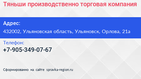 Тяньши, производственно-торговая компания по адресу 432002, Ульяновская область, Ульяновск, Орлова, 21а в дальнейшем Организация, размещена в следующих категориях: