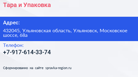 Тара и Упаковка по адресу 432045, Ульяновская область, Ульяновск, Московское шоссе, 68а в дальнейшем Организация, размещена в следующих категориях: