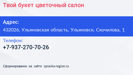 Твой букет, цветочный салон по адресу 432026, Ульяновская область, Ульяновск, Скочилова, 1 в дальнейшем Организация, размещена в следующих категориях:
