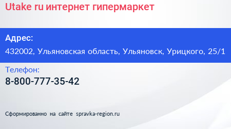Utake.ru, интернет-гипермаркет по адресу 432002, Ульяновская область, Ульяновск, Урицкого, 25/1 в дальнейшем Организация, размещена в следующих категориях: