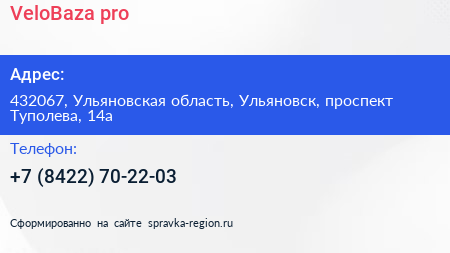 VeloBaza.pro по адресу 432067, Ульяновская область, Ульяновск, проспект Туполева, 14а в дальнейшем Организация, размещена в следующих категориях: