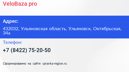 VeloBaza.pro по адресу 432032, Ульяновская область, Ульяновск, Октябрьская, 34а в дальнейшем Организация, размещена в следующих категориях: