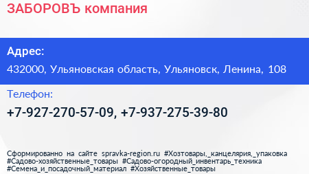 ЗАБОРОВЪ, компания по адресу 432000, Ульяновская область, Ульяновск, Ленина, 108 в дальнейшем Организация, размещена в следующих категориях: