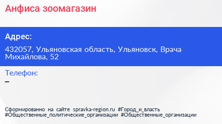 Анфиса, зоомагазин по адресу 432057, Ульяновская область, Ульяновск, Врача Михайлова, 52 в дальнейшем Организация, размещена в следующих категориях: