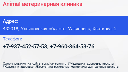 Animal, ветеринарная клиника по адресу 432018, Ульяновская область, Ульяновск, Хваткова, 2 в дальнейшем Организация, размещена в следующих категориях: