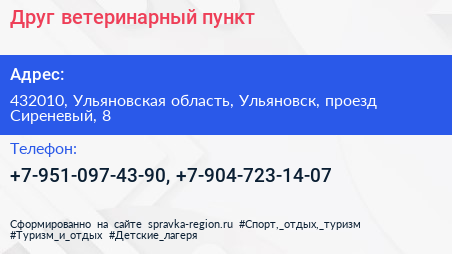 Друг, ветеринарный пункт по адресу 432010, Ульяновская область, Ульяновск, проезд Сиреневый, 8 в дальнейшем Организация, размещена в следующих категориях: