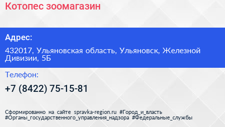 Котопес, зоомагазин по адресу 432017, Ульяновская область, Ульяновск, Железной Дивизии, 5Б в дальнейшем Организация, размещена в следующих категориях: