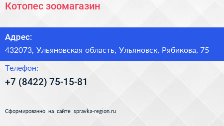 Котопес, зоомагазин по адресу 432073, Ульяновская область, Ульяновск, Рябикова, 75 в дальнейшем Организация, размещена в следующих категориях:
