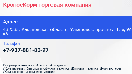 КроносКорм, торговая компания по адресу 432035, Ульяновская область, Ульяновск, проспект Гая, 96 к6 в дальнейшем Организация, размещена в следующих категориях: