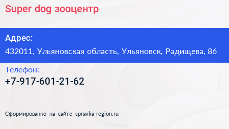 Super dog, зооцентр по адресу 432011, Ульяновская область, Ульяновск, Радищева, 86 в дальнейшем Организация, размещена в следующих категориях: