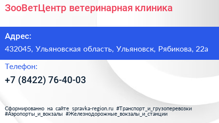 ЗооВетЦентр, ветеринарная клиника по адресу 432045, Ульяновская область, Ульяновск, Рябикова, 22а в дальнейшем Организация, размещена в следующих категориях: