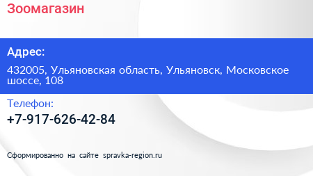 Зоомагазин по адресу 432005, Ульяновская область, Ульяновск, Московское шоссе, 108 в дальнейшем Организация, размещена в следующих категориях: