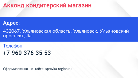 Акконд, кондитерский магазин по адресу 432067, Ульяновская область, Ульяновск, Ульяновский проспект, 4а в дальнейшем Организация, размещена в следующих категориях: