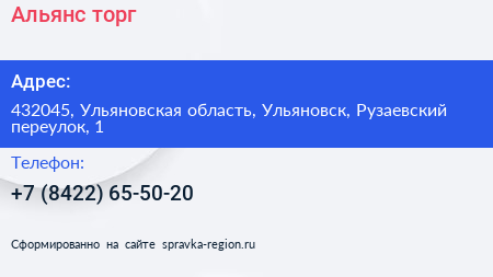 Альянс-торг по адресу 432045, Ульяновская область, Ульяновск, Рузаевский переулок, 1 в дальнейшем Организация, размещена в следующих категориях: