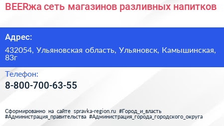 BEERжа, сеть магазинов разливных напитков по адресу 432054, Ульяновская область, Ульяновск, Камышинская, 83г в дальнейшем Организация, размещена в следующих категориях: