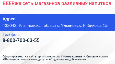BEERжа, сеть магазинов разливных напитков по адресу 432042, Ульяновская область, Ульяновск, Рябикова, 15г в дальнейшем Организация, размещена в следующих категориях: