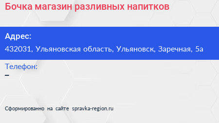 Бочка, магазин разливных напитков по адресу 432031, Ульяновская область, Ульяновск, Заречная, 5а в дальнейшем Организация, размещена в следующих категориях: