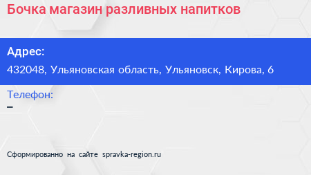 Бочка, магазин разливных напитков по адресу 432048, Ульяновская область, Ульяновск, Кирова, 6 в дальнейшем Организация, размещена в следующих категориях: