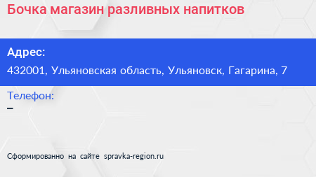 Бочка, магазин разливных напитков по адресу 432001, Ульяновская область, Ульяновск, Гагарина, 7 в дальнейшем Организация, размещена в следующих категориях: