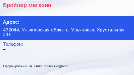 Бройлер, магазин по адресу 432044, Ульяновская область, Ульяновск, Хрустальная, 34в в дальнейшем Организация, размещена в следующих категориях: