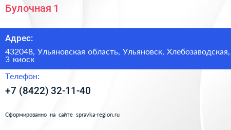 Булочная №1 по адресу 432048, Ульяновская область, Ульяновск, Хлебозаводская, 3 киоск в дальнейшем Организация, размещена в следующих категориях: