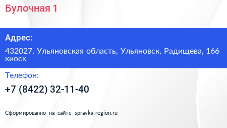 Булочная №1 по адресу 432027, Ульяновская область, Ульяновск, Радищева, 166 киоск в дальнейшем Организация, размещена в следующих категориях: