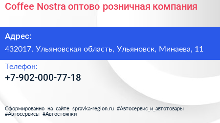Coffee Nostra, оптово-розничная компания по адресу 432017, Ульяновская область, Ульяновск, Минаева, 11 в дальнейшем Организация, размещена в следующих категориях: