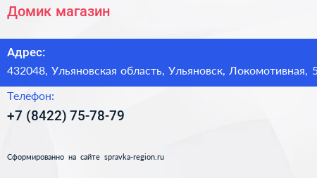 Домик, магазин по адресу 432048, Ульяновская область, Ульяновск, Локомотивная, 5 в дальнейшем Организация, размещена в следующих категориях: