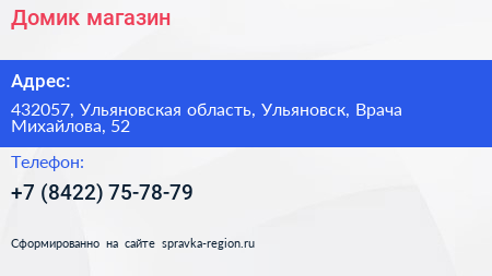 Домик, магазин по адресу 432057, Ульяновская область, Ульяновск, Врача Михайлова, 52 в дальнейшем Организация, размещена в следующих категориях: