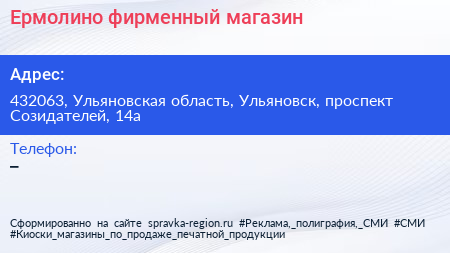 Ермолино, фирменный магазин по адресу 432063, Ульяновская область, Ульяновск, проспект Созидателей, 14а в дальнейшем Организация, размещена в следующих категориях: