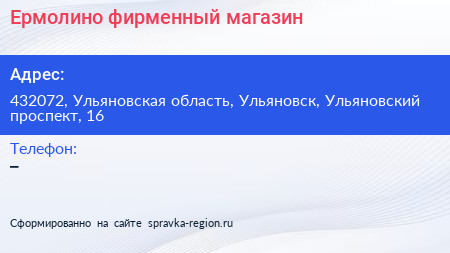Ермолино, фирменный магазин по адресу 432072, Ульяновская область, Ульяновск, Ульяновский проспект, 16 в дальнейшем Организация, размещена в следующих категориях: