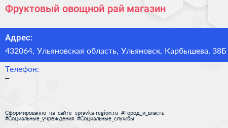 Фруктовый овощной рай, магазин по адресу 432064, Ульяновская область, Ульяновск, Карбышева, 38Б в дальнейшем Организация, размещена в следующих категориях: