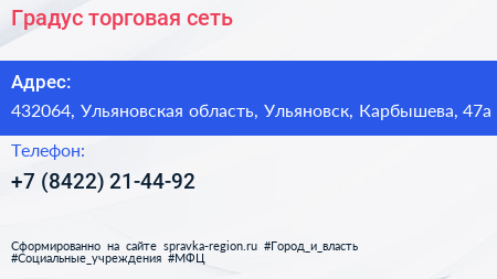 Градус, торговая сеть по адресу 432064, Ульяновская область, Ульяновск, Карбышева, 47а в дальнейшем Организация, размещена в следующих категориях:
