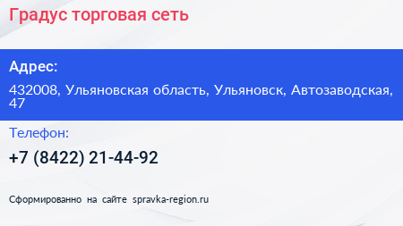 Градус, торговая сеть по адресу 432008, Ульяновская область, Ульяновск, Автозаводская, 47 в дальнейшем Организация, размещена в следующих категориях: