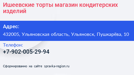 Ишеевские торты, магазин кондитерских изделий по адресу 432005, Ульяновская область, Ульяновск, Пушкарёва, 10 в дальнейшем Организация, размещена в следующих категориях:
