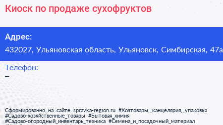 Киоск по продаже сухофруктов по адресу 432027, Ульяновская область, Ульяновск, Симбирская, 47а в дальнейшем Организация, размещена в следующих категориях: