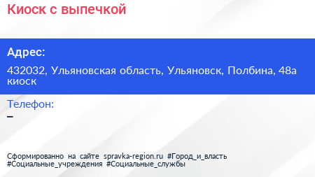 Киоск с выпечкой по адресу 432032, Ульяновская область, Ульяновск, Полбина, 48а киоск в дальнейшем Организация, размещена в следующих категориях:
